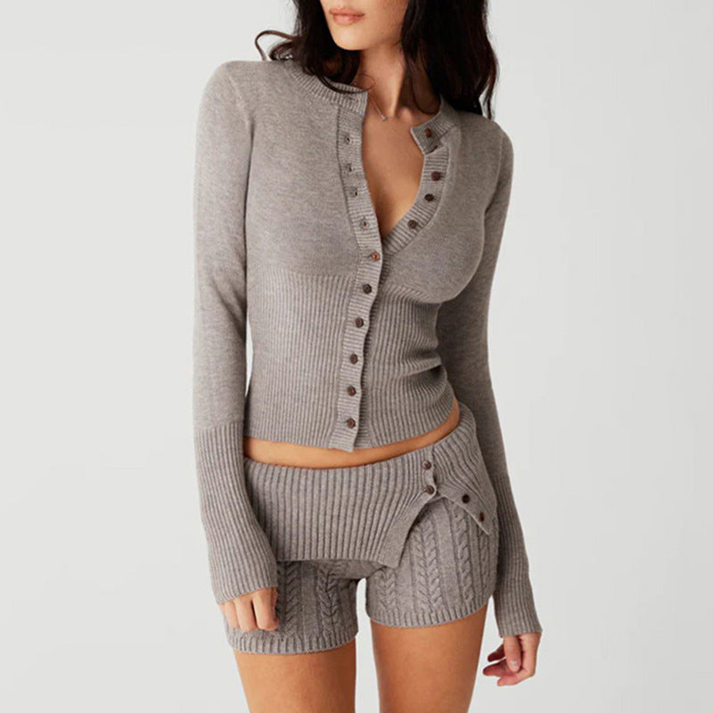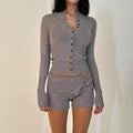 💫 Chic Two-Piece Knit Set: Button-up top and matching shorts for a sleek and cozy look.